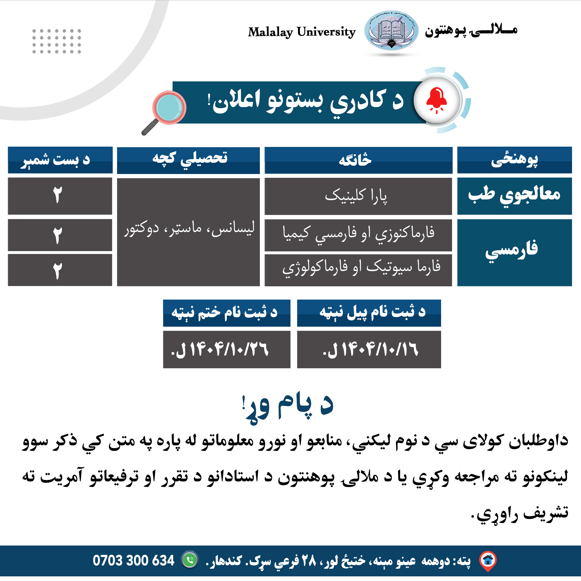...د معالجوي طب او فارمسي پوهنځیو د کادري بستونو اعلان! (دوهم ځل) ملالۍ پوهنتون په معالجوي طب پوهنځي او فارمسي پوهنځي کي څلور تنه استادان مقرروي. د نو.....