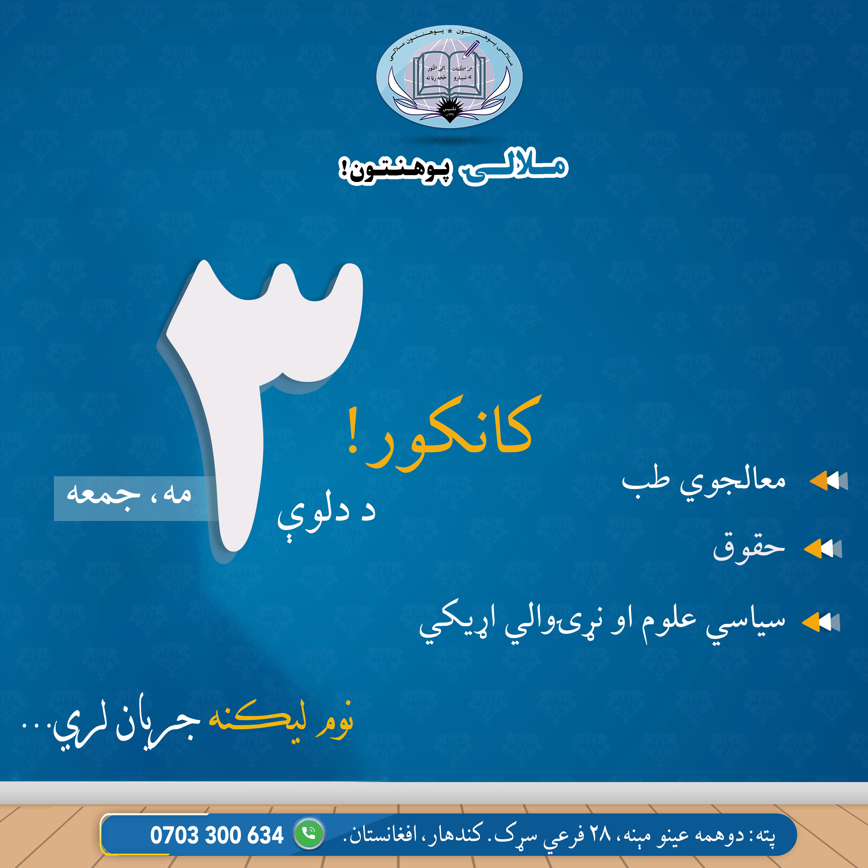 ... جمعه، د دلوې ۳ مه عمومي کانکور په طب، حقوقو او سیاسي علومو پوهنځیو کي اخیستل کېږي. له دې کم وخت څخه ګټه واخلئ او همدا نن نوم‌لیکني له پاره مراجعه و.....