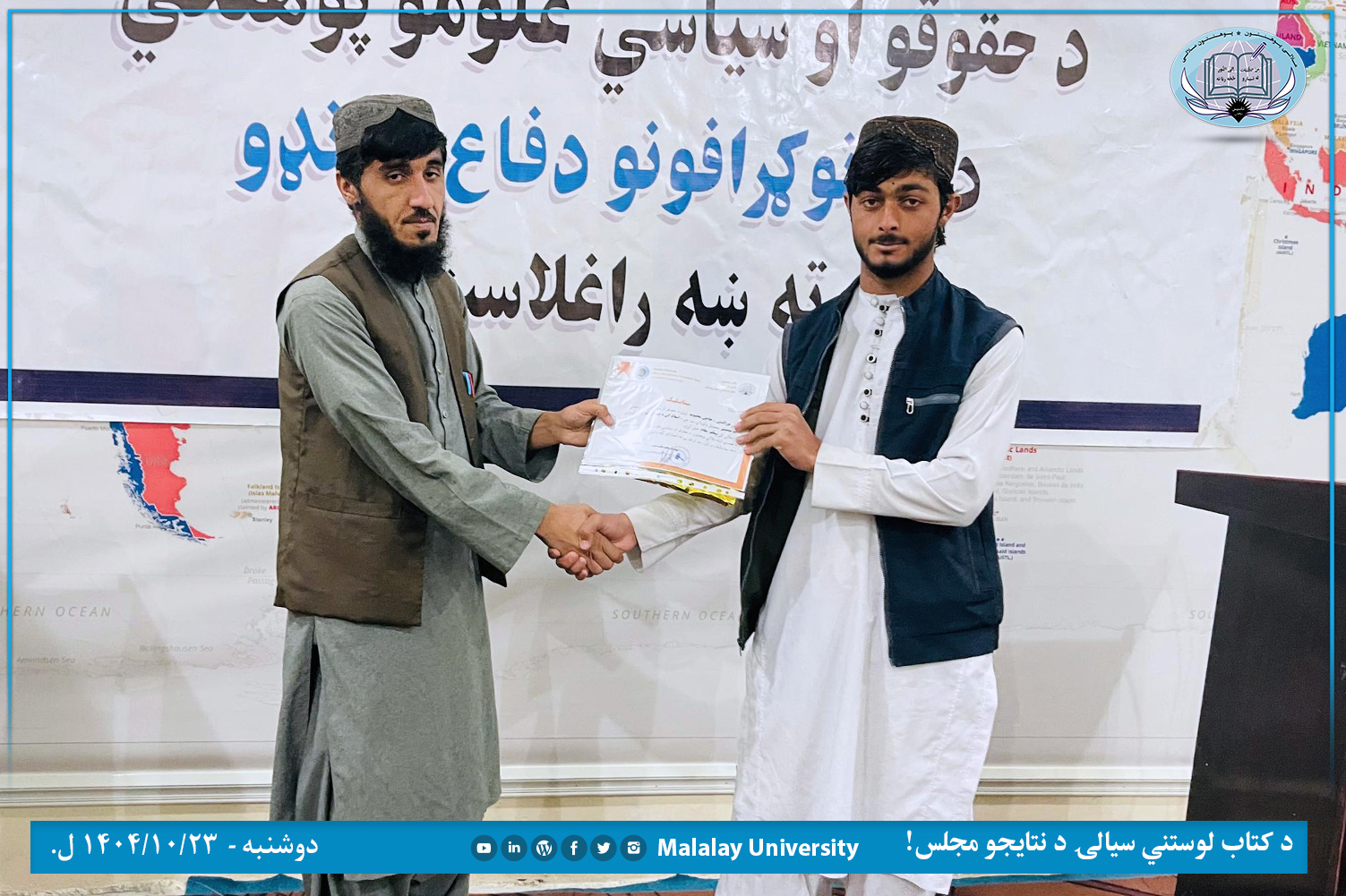 د حقوقو او سیاسي علومو پوهنځي د پلان له مخي په اسلام کي د عباداتو فقهې کتاب د اخیستل سوې تحریري ازمویني نتایج تیره دوشنبه (۱۴۰۴/۱۰/۲۲ ل.) اعلان او ګټونکو ته یې ډالۍ او ستاینلکونه ورکړل سول.