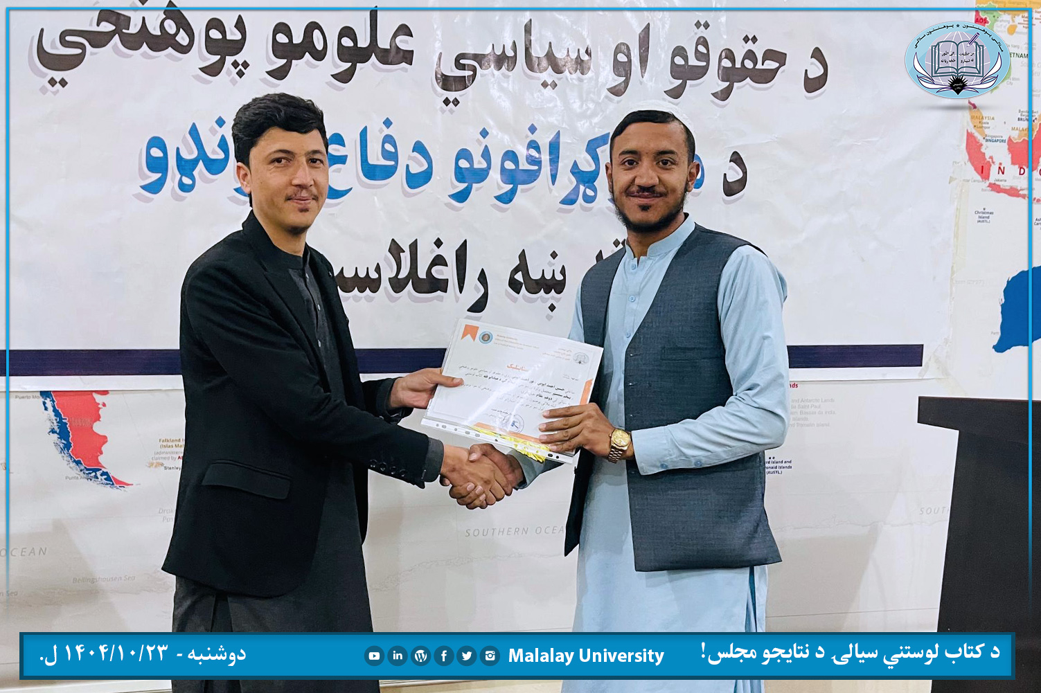 له هغه وروسته پنځو لوړو نمرو ترلاسه کوونکو ته (محمد اشرف، حسین احمد ایوبي، محمد عیسی، محمد فهیم او نورالدین) د پوهنتون له خوا ډالۍ او ستاینلیکونه ورکړل سول او مجلس د دعاء په ویلو سره پای ته ورسېد.