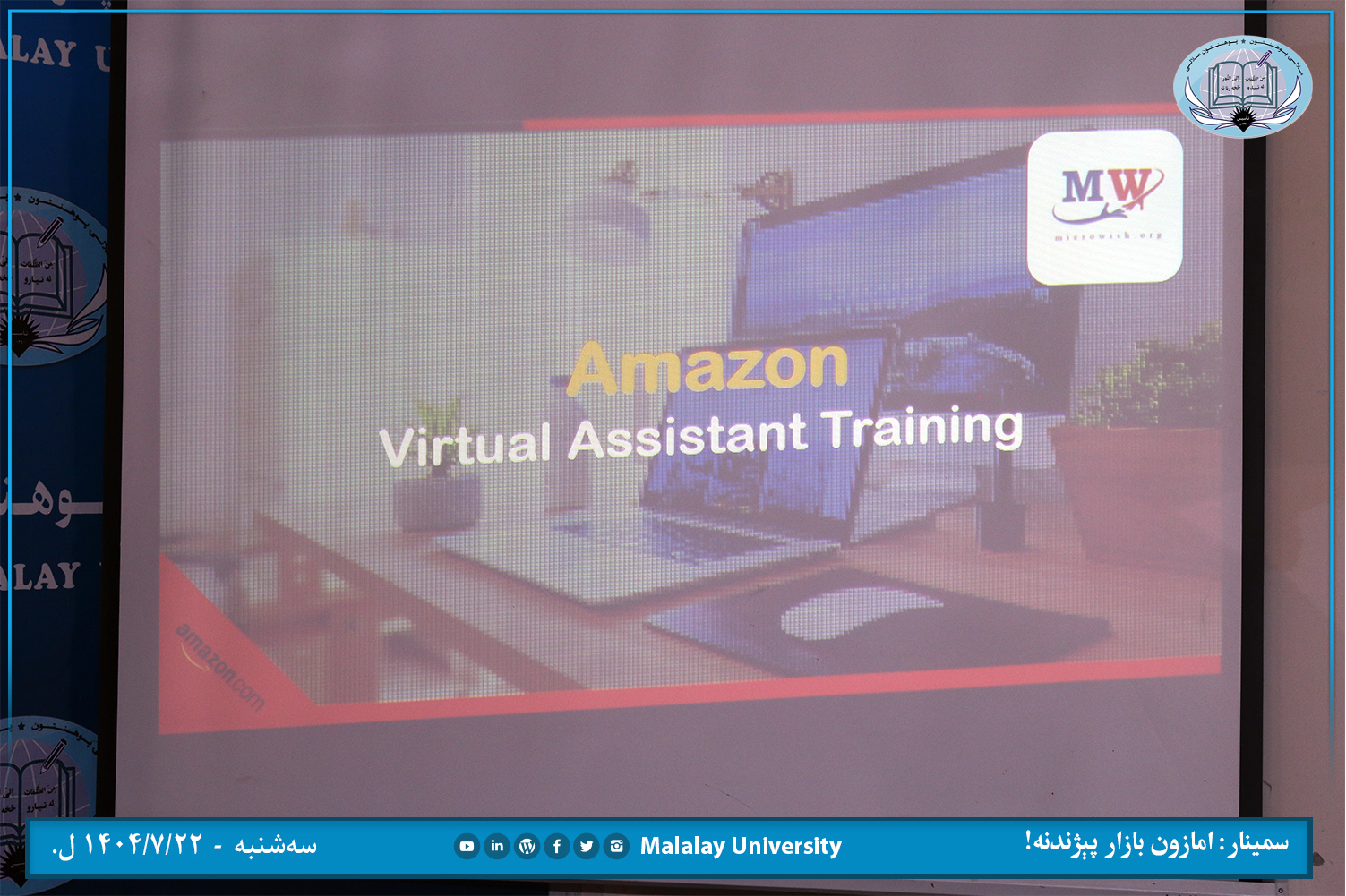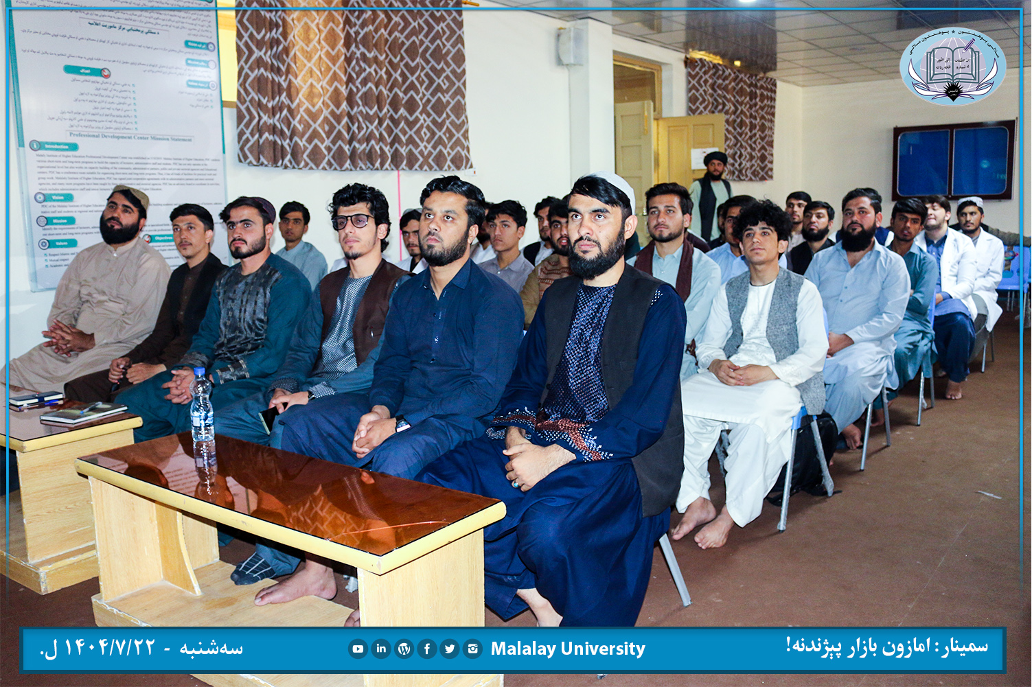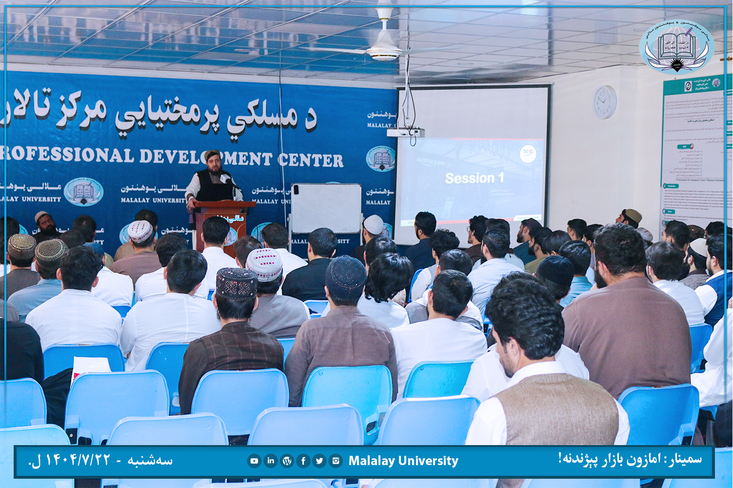 د ملالۍ پوهنتون د مسلکي پرمختیايي مرکز په تالار کي نن سهشنبه (۱۴۰۴/۷/۲۲ ل.) د ښاغلي انجینر عنایت الله عنایت له خوا د امازون آنلاین بازار پېژندني معلوماتي سمینار ارائه سو.