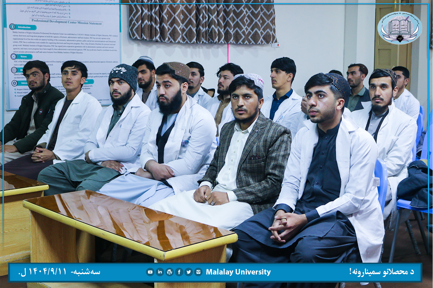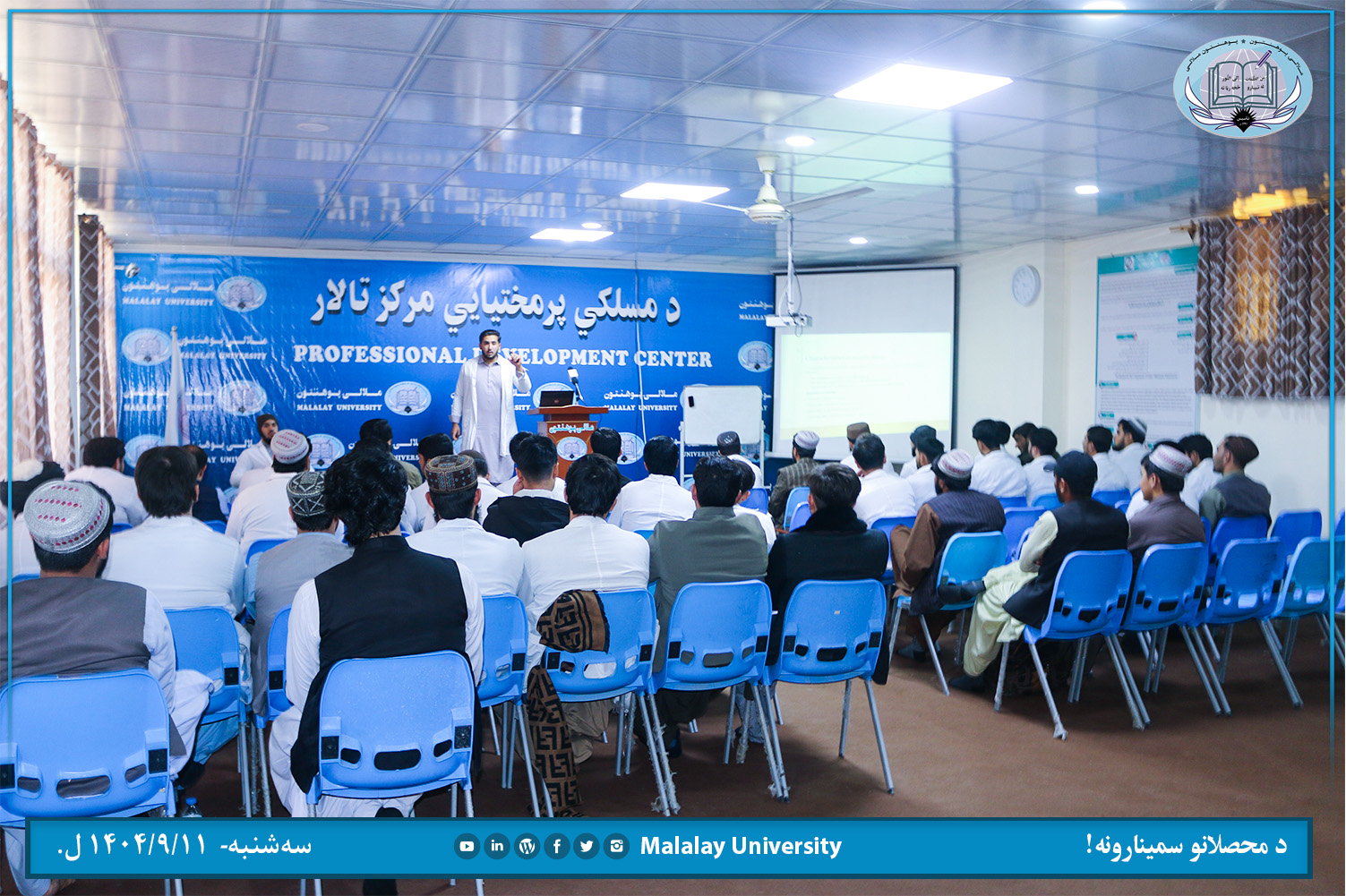د ملالۍ پوهنتون طب پوهنځي د درېیم با سمسټر محصل ښاغلي فرهاد د اسکلیټي عضلاتو تر سرلیک لاندي پرون سهشنبه (۱۴۰۴/۹/۱۱ ل.) خپل چمتو کړی سمینار د لارښود استاد ښاغلي ډاکټر محد عیسی عَلمي په لارښوونه د ژبو او مسلکي پرمختیايي مرکز په تالار کي ارائه کړ.