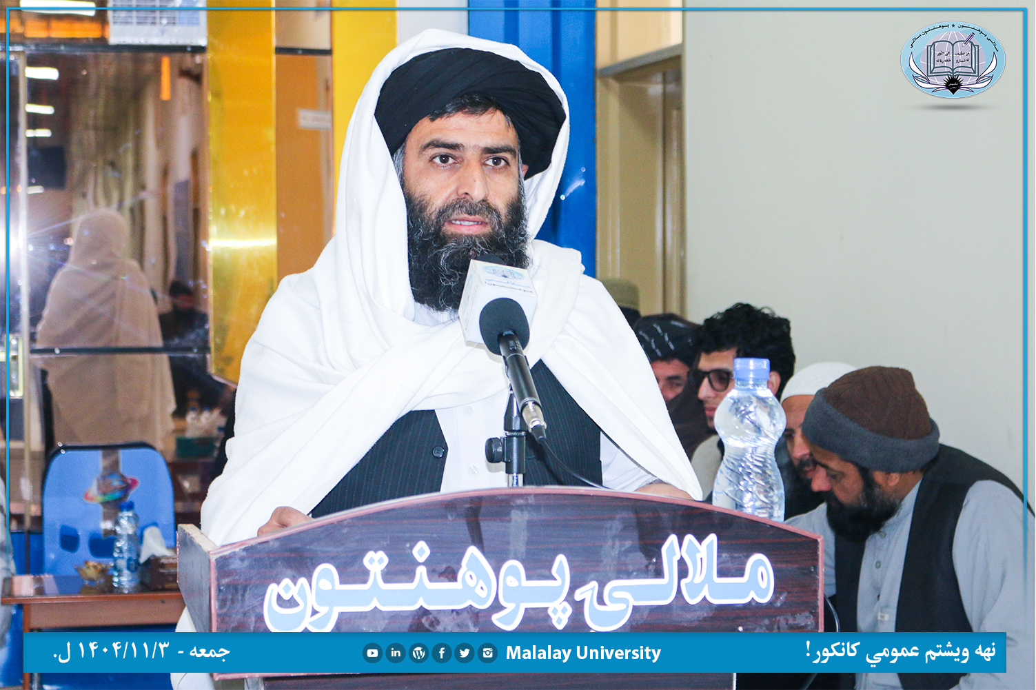 عمومي رئیس ښاغلي مولوي رحمت الله نیازي پیلیزه وینا وکړه او وې ویل: « د ملالۍ پوهنتون رهبري، استادان او اداري کارمندان د ټولني تکړه کسان دي او دلته مؤظف دي چي ستاسو له پاره غوره خدمات ترسره کړي. تاسو به خپل انتخاب تل ویاړئ ځکه ملالۍ پوهنتون د تاریخ په اوږدو کي ټولني ته دا خبره ثابته کړي ده.»