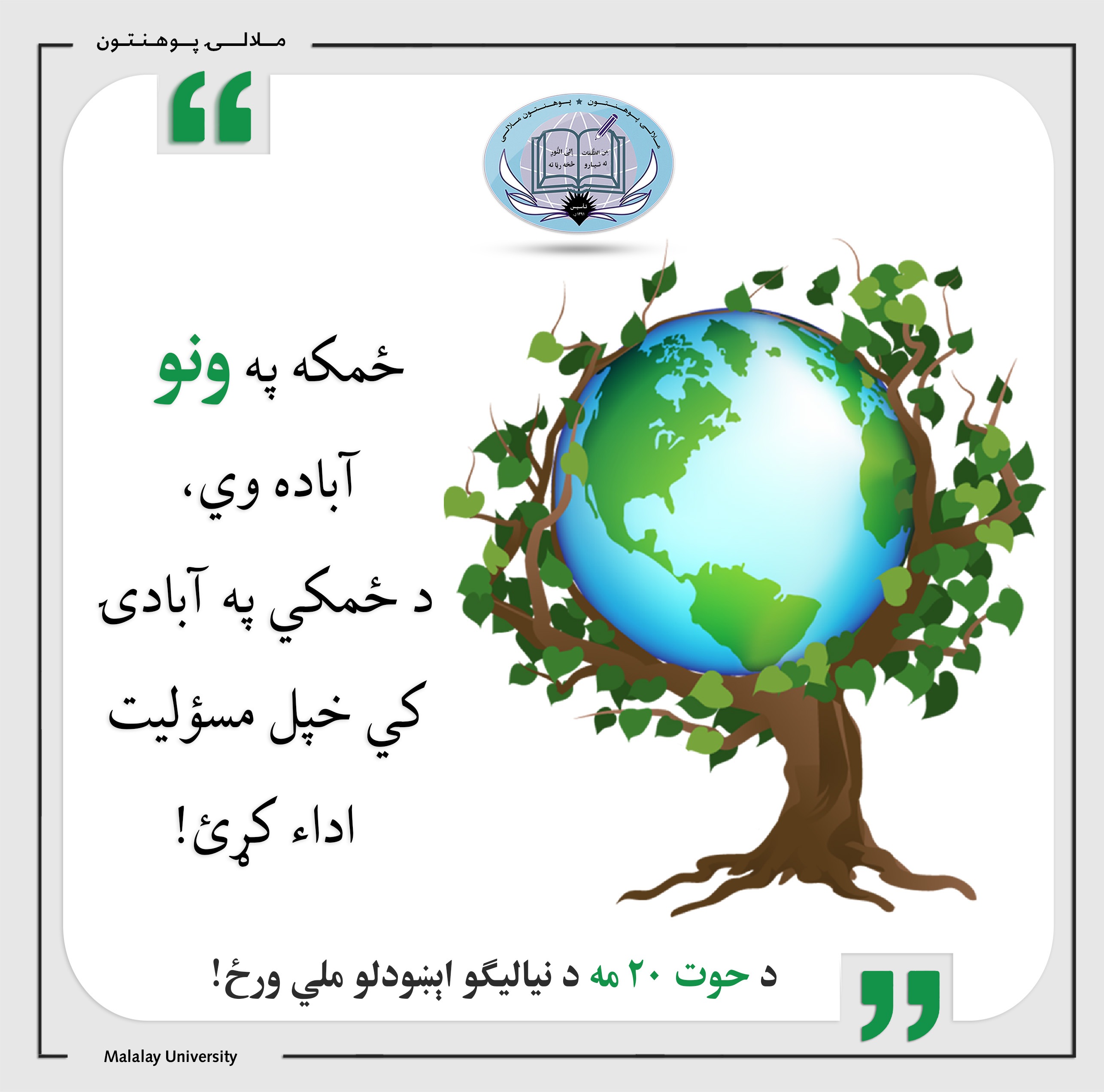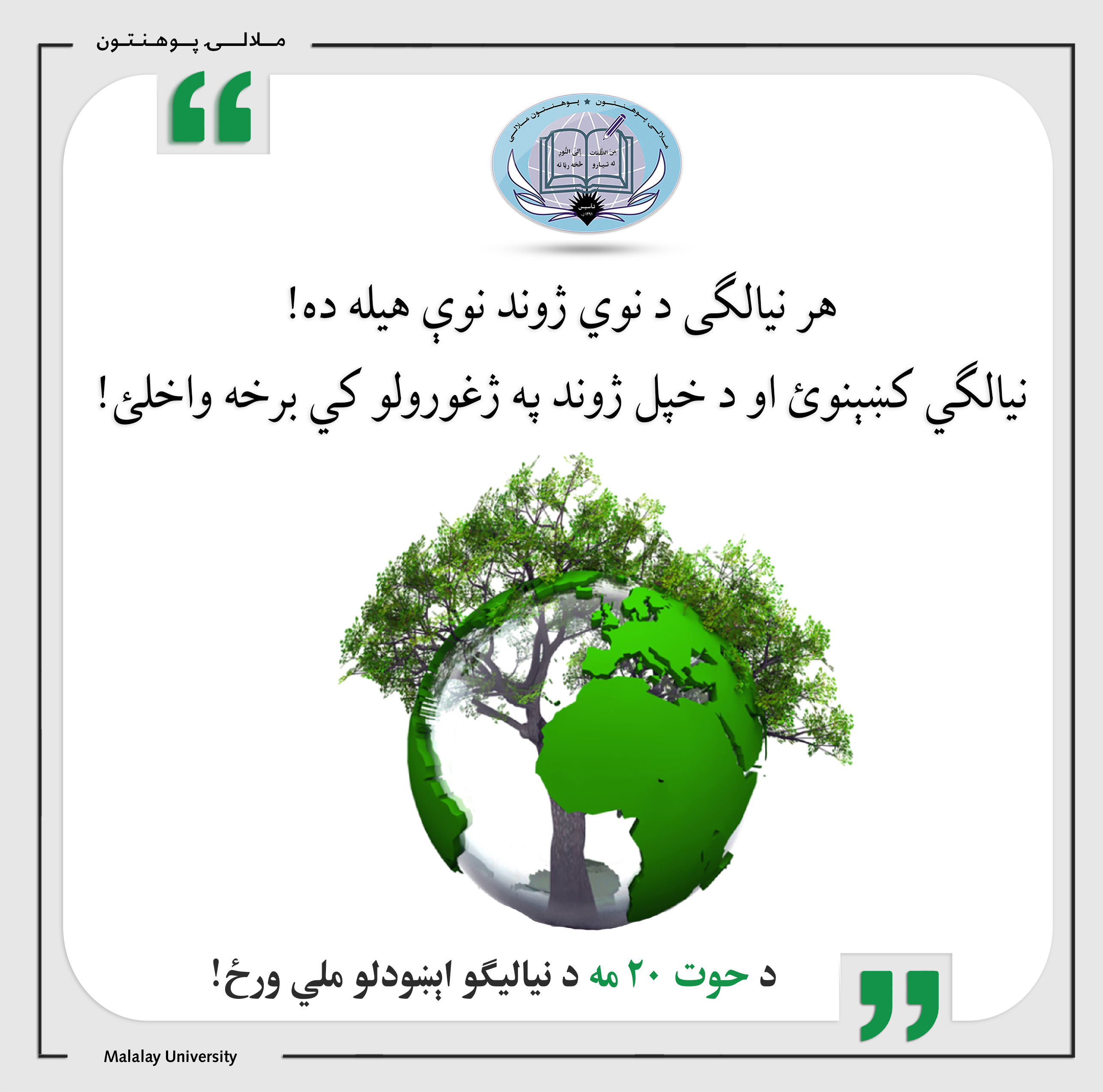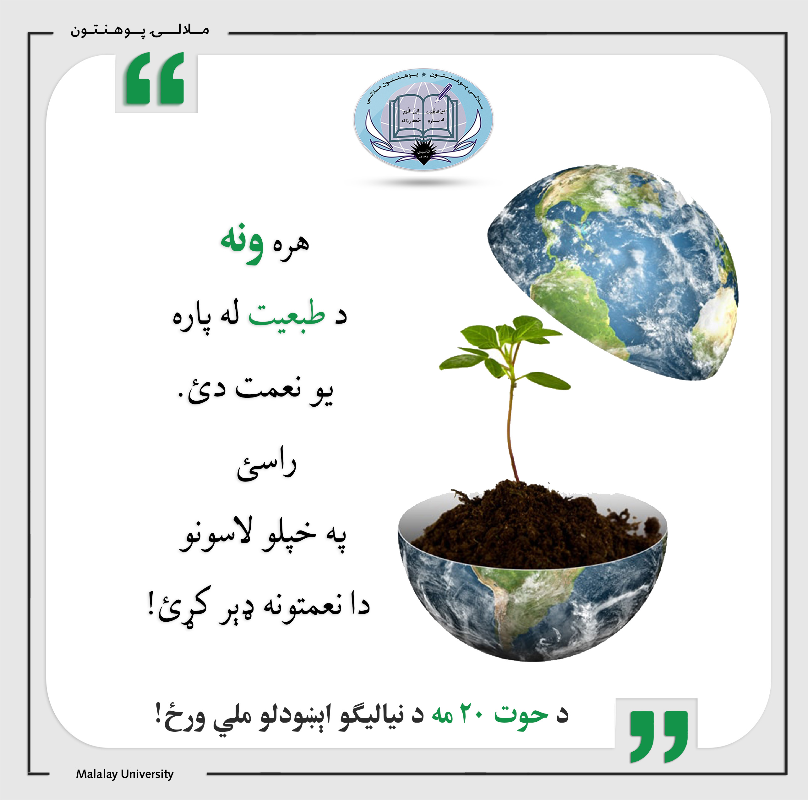 د نیالګیو اېښودلو ورځ! #ملالۍ_له_تیارو_څخه_رڼا_ته! ویب پاڼه: www.Malalay.edu.af فېسبوک او انسټاګرام: Malalay.mihe ټوېټر: Malalayedu لنکډان: Malalay University یوټیوب: Malalay University