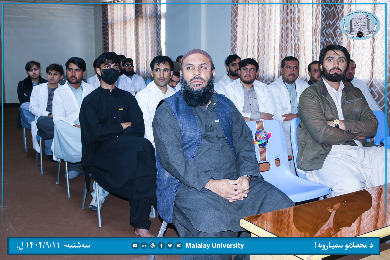د ملالۍ پوهنتون طب پوهنځي د درېیم با سمسټر محصل ښاغلي فرهاد د اسکلیټي عضلاتو تر سرلیک لاندي پرون سهشنبه (۱۴۰۴/۹/۱۱ ل.) خپل چمتو کړی سمینار د لارښود استاد ښاغلي ډاکټر محد عیسی عَلمي په لارښوونه د ژبو او مسلکي پرمختیايي مرکز په تالار کي ارائه کړ.