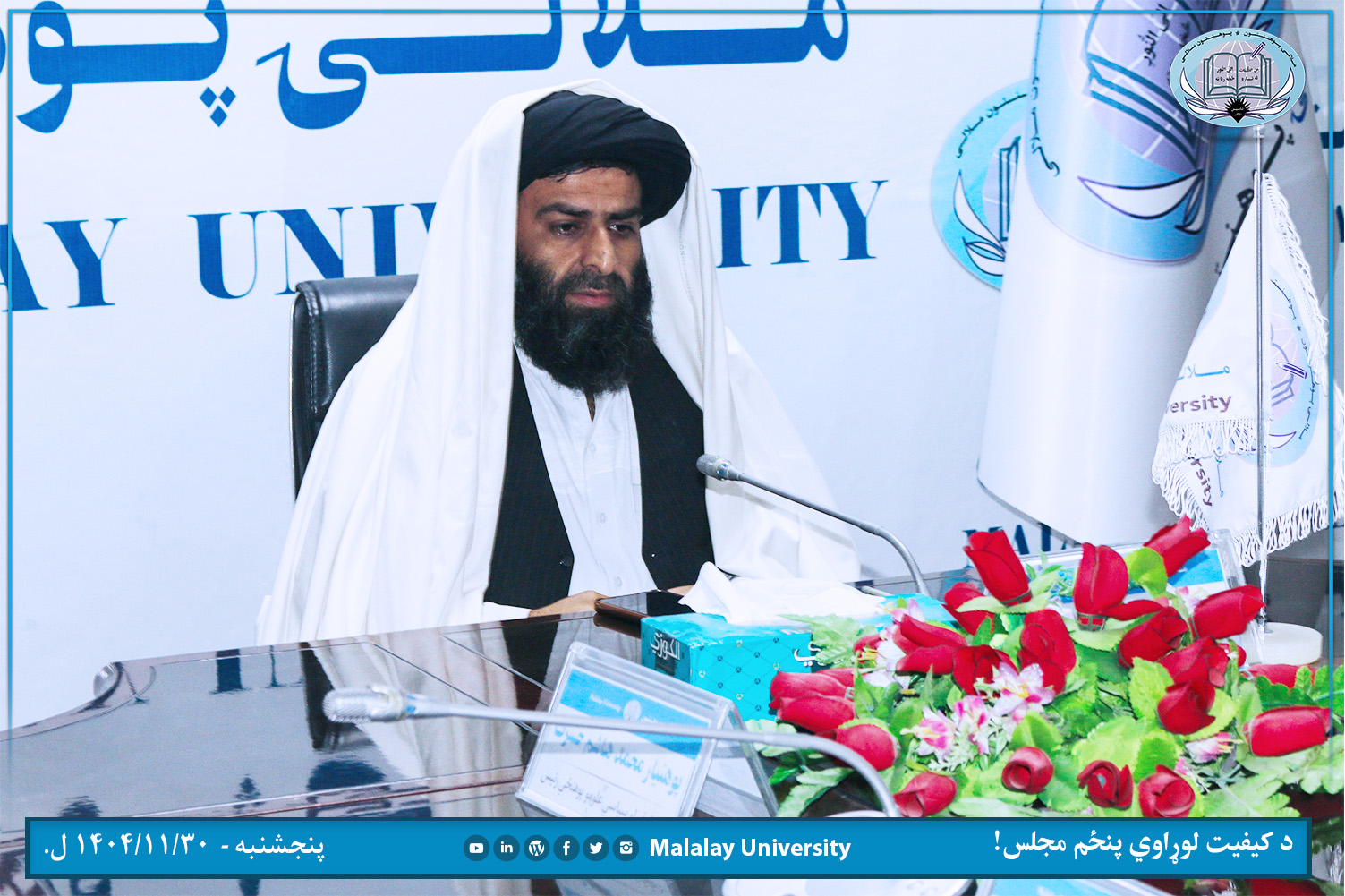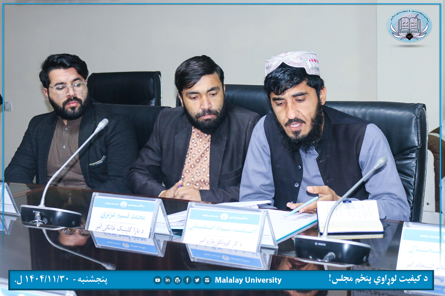 د شورا ګانو او کمېټو د مهالوېش له مخي د کیفیت لوړاوي پنځم مجلس نن پنجشنبه (۱۴۰۴/۱۱/۳۰ ل.) د غونډو په تالار کي د علمي چارو مرستیال ښاغلي پوهنیار عبدالرحمن سعید په مشرۍ دائر سو.