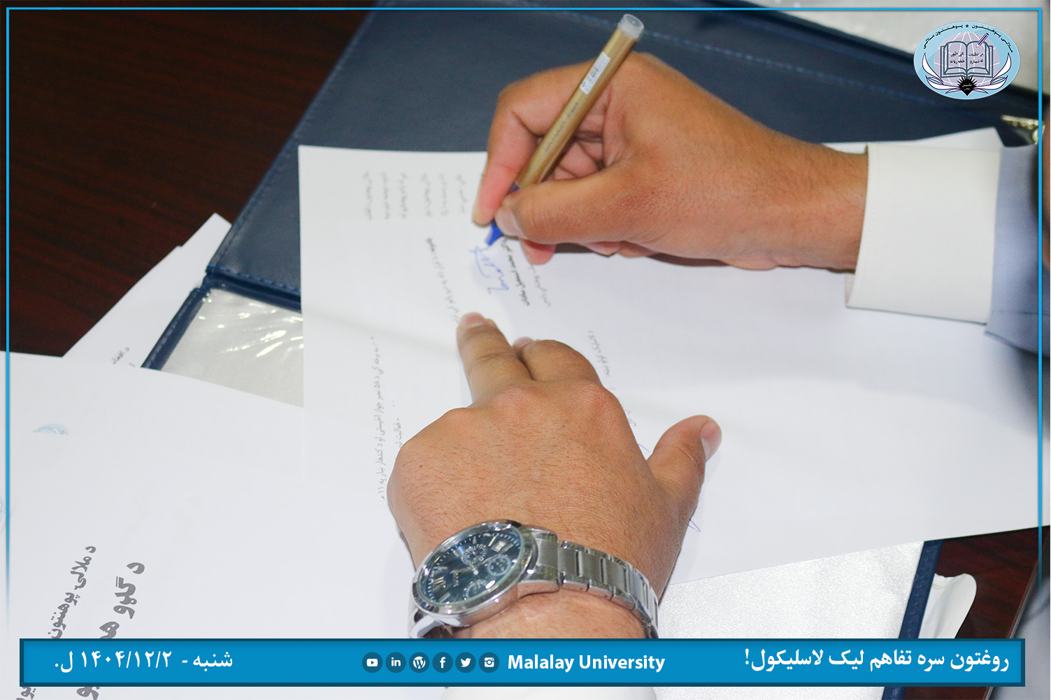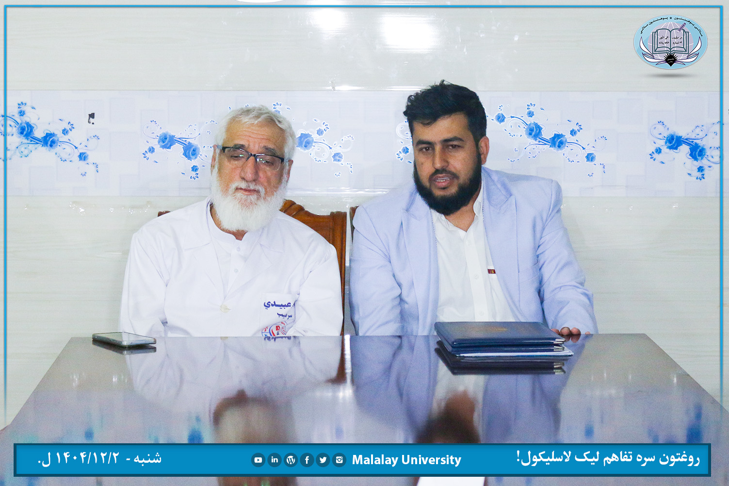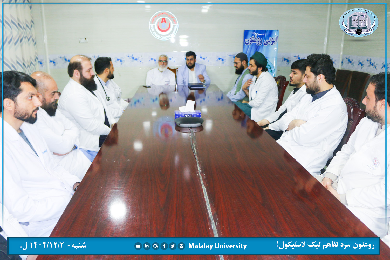 د ملالۍ پوهنتون طب پوهنځي او نوي ایوبي روغتون تر منځ د دوه اړخیزه همکاریو تفاهملیک نن شنبه ( ۱۴۰۴/۱۲/۲ ل.) د یاد روغتون د غونډو په تالار کي د دواړو لورو استازو په حضور کي لاسلیک سو.